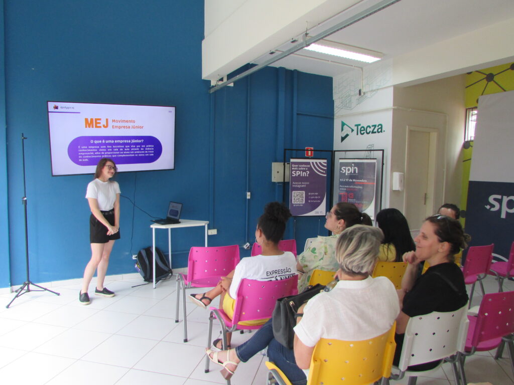 Durante a tarde do mesmo dia, houve uma apresentação de Projetos de Extensão e Empresas Juniores da Universidade Federal do Paraná, no HUB de Inovação da SPIn. A apresentação iniciou com as estudantes Mariana Prokopowiski e Emanuelly Orbeli de Oliveira, que apresentaram as EJs Polygon e Isomeria, respectivamente. As palestrantes, além de apresentarem as Empresas Juniores – EJs – e os trabalhos que realizam, também relataram os desafios enfrentados por mulheres, no setor de exatas e científico, e no ramo de trabalho em que estão, devido aos estigmas presentes e da pouca presença feminina nesses espaços, um cenário que está sendo superado aos poucos.